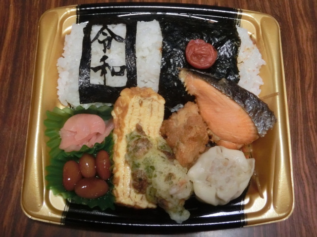 夜は、令和弁当を食べました\(^o^)/ 海苔で令和を型どっている分、値段が張っていたようですが、夜遅くにスーパーマーケットに行ったので、半額\(^o^)/