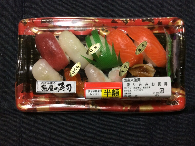 主人が帰ってきました。お寿司を買ってきました。夕食がまだだったので、お寿司をつまみながら晩酌しています。