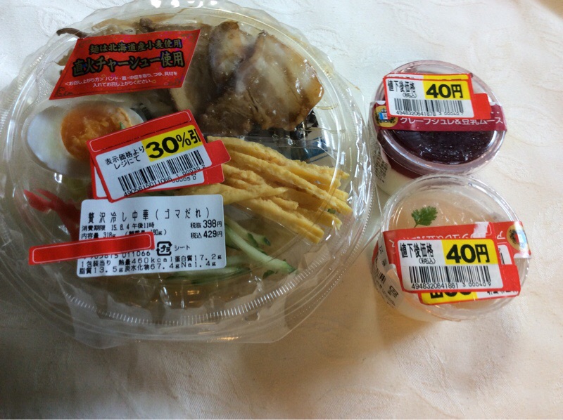 ウォーキングに行ってきました。お昼ごはんとデザートを買ってきました。暑くて台所に立つのがおっくうです。冷やし中華は大好きですが、ダイエット中なので若干炭水化物がオーバーなのが気になります。このところの体重は停滞気味ですが、増えていない事をよしとします。一万歩歩きました。