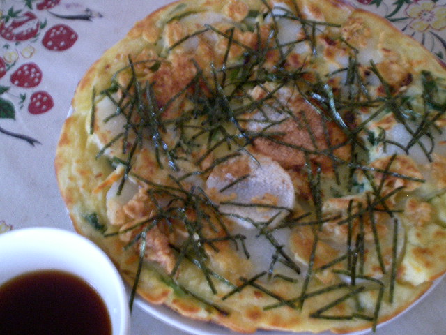 後は一昨日のヒラヤーチーの合わせ具に山芋をトッピングして息子のお昼です(^^ゞ