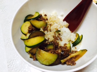 晩ご飯は挽肉とズッキーニの黒酢丼、トマトのマリネ、昨日の魚の残りです◡̈⃝♩