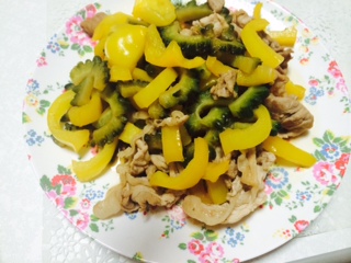 今晩はゴーヤとパプリカ豚肉の黒酢炒め、ハッシュドポテトです♬
