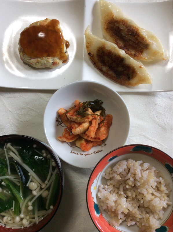 お昼ごはんは 鶏と豆腐のふんわり焼き、大粒餃子、割り干しキムチ、ほうれん草とエノキとワカメの味噌汁、雑穀玄米ごはん100gです。いただきます。