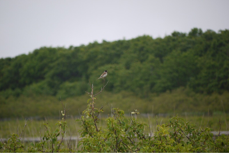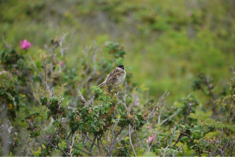 ワッカ原生花園のノゴマです。北海道の海岸や山地の草原で昆虫類を主食として生息しています。オスは喉が鮮やかなルビー色をしています。