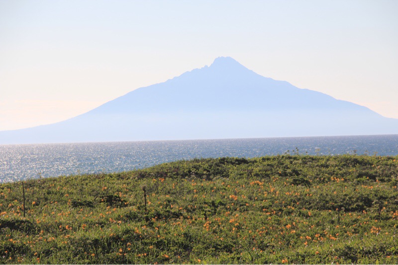 苫前町から見た利尻富士です。エゾカンゾウがきれいです。