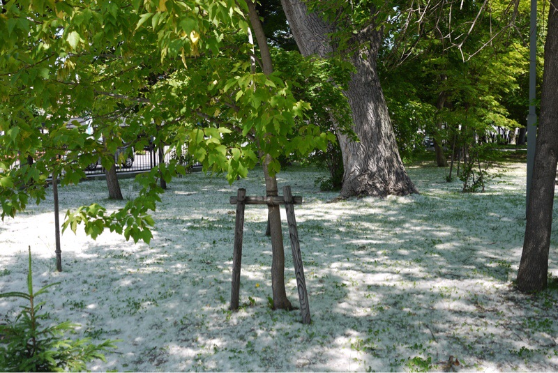 ウォーキングに行ってきました。美術館の前庭にポプラの綿毛がたくさん落ちていました。まるで雪のように見えました。