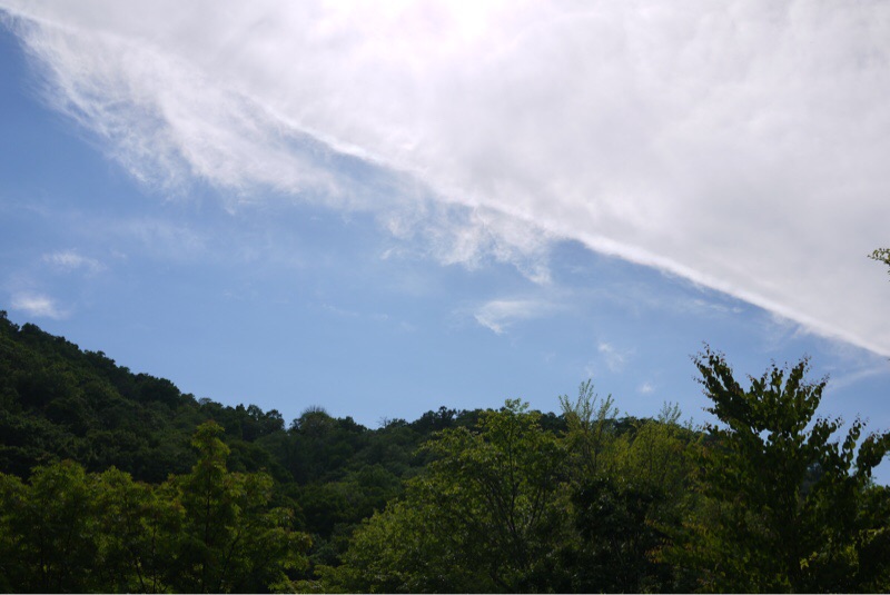 緑の山に青い空と白い雲 はっきり線を引いたようです。不思議な空模様です。