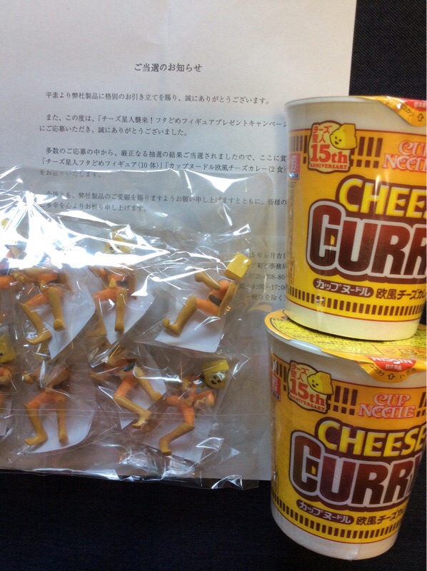 久しぶりに懸賞に当選しました。フィギュアのカップ麺のフタどめを初めて見ました。