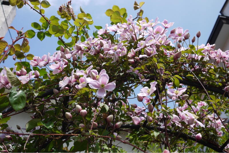 ウォーキングに行ってきました。クレマチス ピンクパーフェクションがきれいでした。風が強く冬のような寒さでした。久しぶりにコートを着ました。