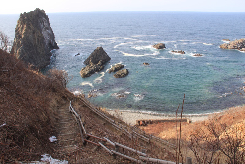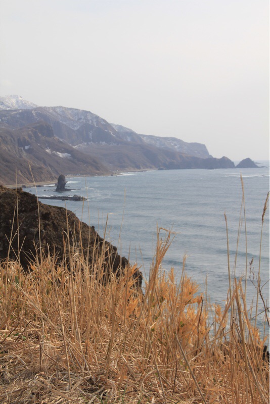 積丹半島の島武意(しまむい)海岸にきました。日本の渚百選に選ばれた海岸です。春の積丹ブルーです。