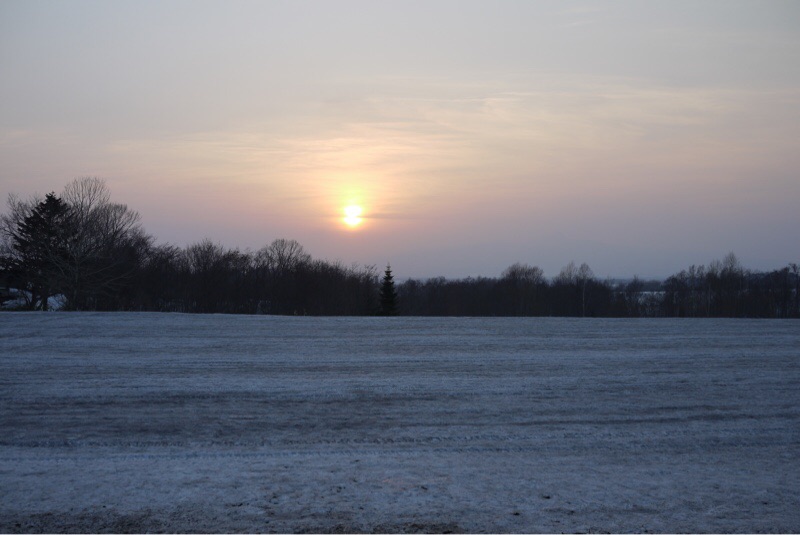 洞爺湖町の畑に沈む太陽に雲がかかっています。太陽が二つに見えるような気がします。