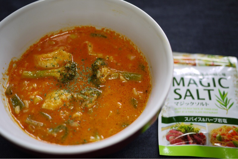 お昼は野菜ジュースと鱈のリゾットを作りました。材料は玄米ごはん、ニンニクのみじん切り、オリーブオイル、ミックスチーズ、野菜です。味付けはマジックソルトを使いました。マジックソルトは100均で買いました。マジックソルトは色々な料理に使えて便利です。それではいただきます。