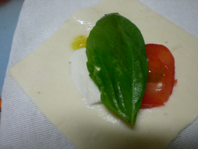 パイ生地にミニトマト2種・モッツァレラチーズ・バジル・ピザソースを🎶