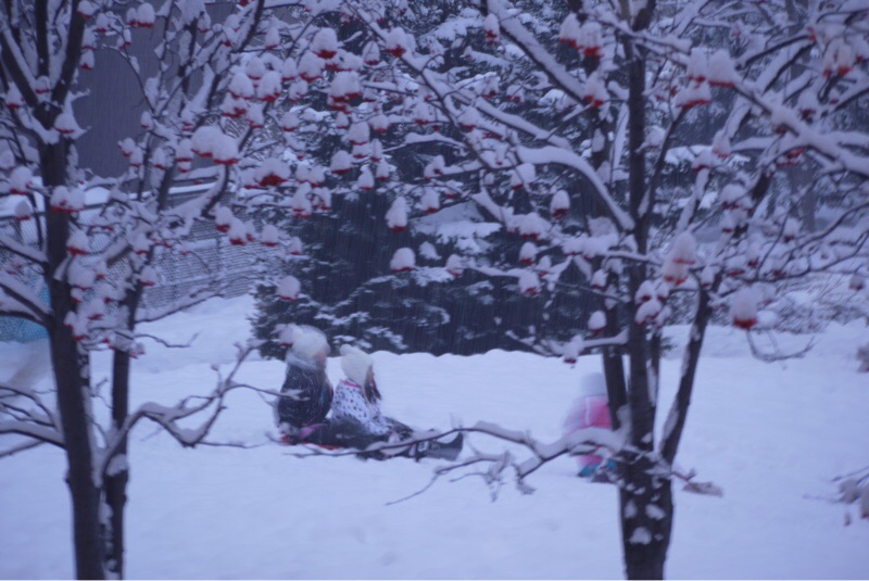 相変わらず雪が降り続いています。今日の日没は16:02でした。写真は夜景&人物モードで撮りました。明るく写っていますが、すっかり日が暮れました。元気な女の子たちです。