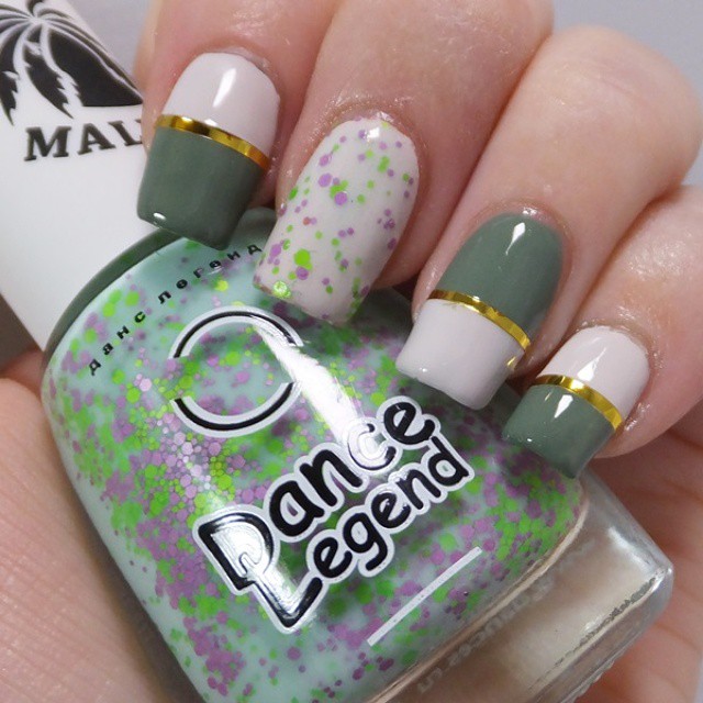 中指には手に持っているポリッシュを使っていますが、ちょっと工夫をして、ベースカラーの緑色だけ落とし、ホロだけを爪に残しました。