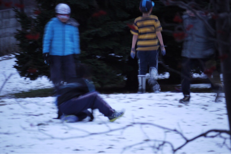 公園に半袖で遊んでいる子がいます。今日は真冬日で今の気温は−2℃です。札幌の日没は15:59でした。日が暮れて暗くなってきました。子供たちはまだまだ遊び足りないようです。
