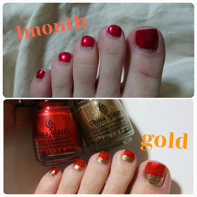 1ヶ月経過してもまだ赤色が貼り付いているので、根元にゴールドをプラスして、まだ当分このままで楽をします♪