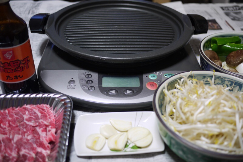 夕ご飯はジンギスカンです。家で食べるのは久しぶりです。お肉はラム肉です。他にカルビも用意しました。ベル成吉思汗ジンギスカンのたれは北海道では定番のたれです。