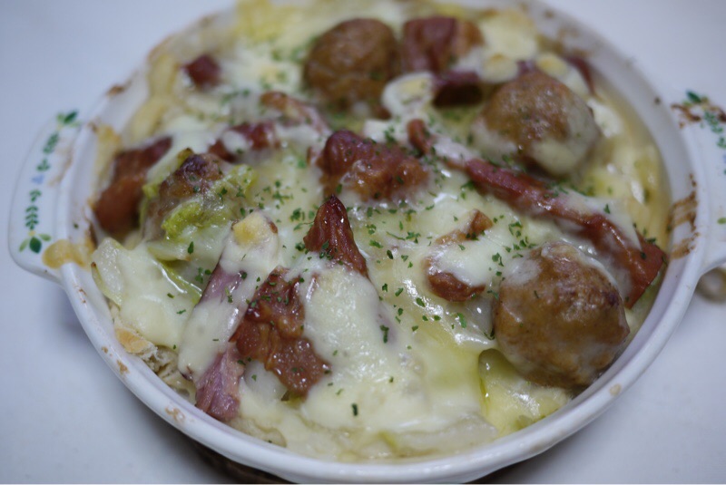お昼は昨夜の残りの白菜と肉だんごのクリーム煮とベーコンでパングラタンを作りました。いただきます。