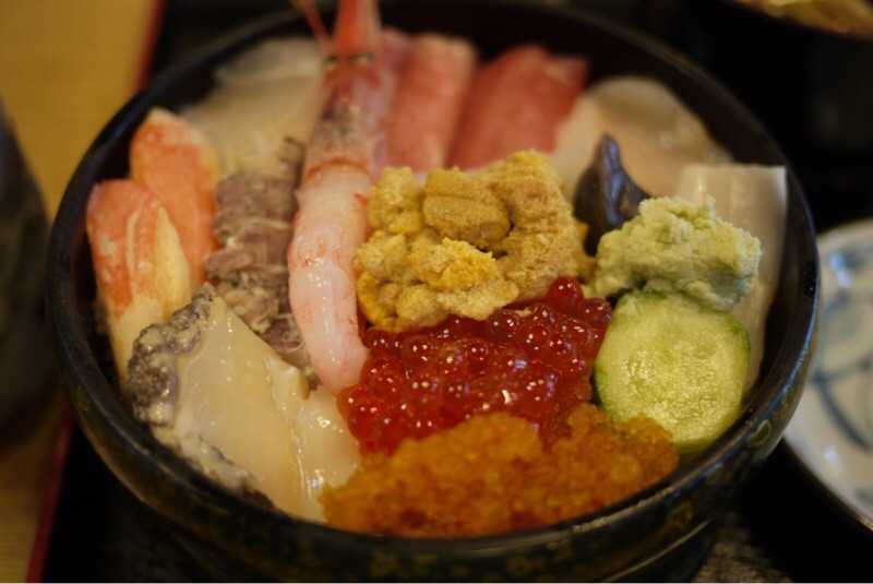 こちらは主人が頼んだ生ちらしです。お蕎麦がついて2100円です。いくら丼の量が多くて主人に半分お願いしました。