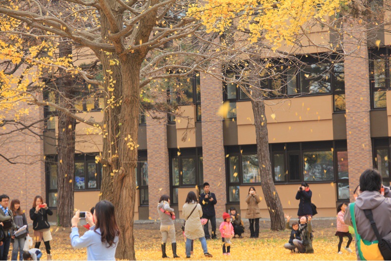 北大の銀杏並木でいちょうの葉がいっぺんに落ちてきました。少しの風に葉っぱが落ちます。黄色の世界はちょっと寂しい冬の入り口です。