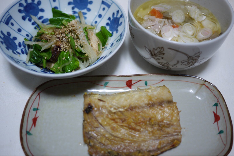 夕ご飯は鯖の西京焼き 豚汁 和え物です。豚汁に実家の最後のさやいんげんをいれました。和え物はゆうべの残りのチキン照り焼き 大根 セロリ サラダほうれん草に青じそドレッシングで和えました。今晩の残り物創作料理はうまくいったかな。たまに失敗するのです。