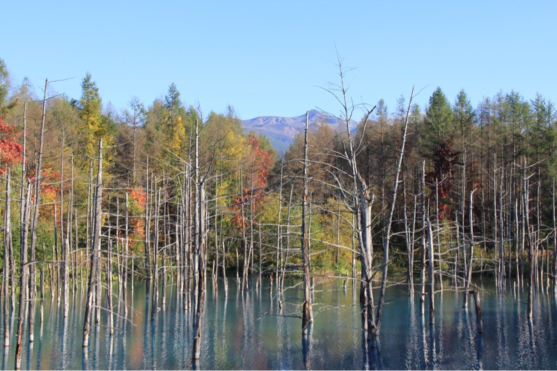 美瑛の青い池に行きました。午前中曇っていたお天気が見事に晴れわたり池の青と青空のコントラストが美しい水面です。以前に比べて池の色が薄くなったような気がします。お天気のせいかもしれません。