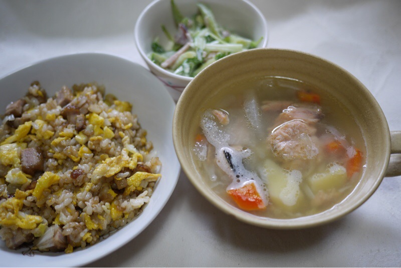 お昼ご飯はゆうべのマグロの竜田焼きと玄米ご飯でチャーハンを作りました。三平汁は作り過ぎました。あと何回かは食べないとなくなりません。