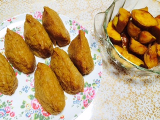 今晩はちらし寿司で作ったいなり寿司と、もらった安納芋で作った大学芋。
