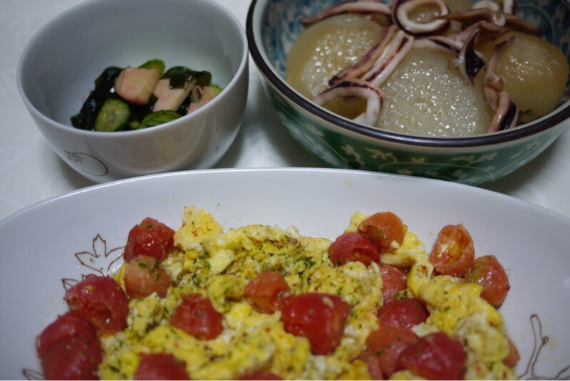 夕ご飯はイカ大根 ミニトマトと卵の炒めもの 酢の物を作りました。実家の野菜も残り少なくなってきましたが、また送ってもらえる事になり大助かりです。