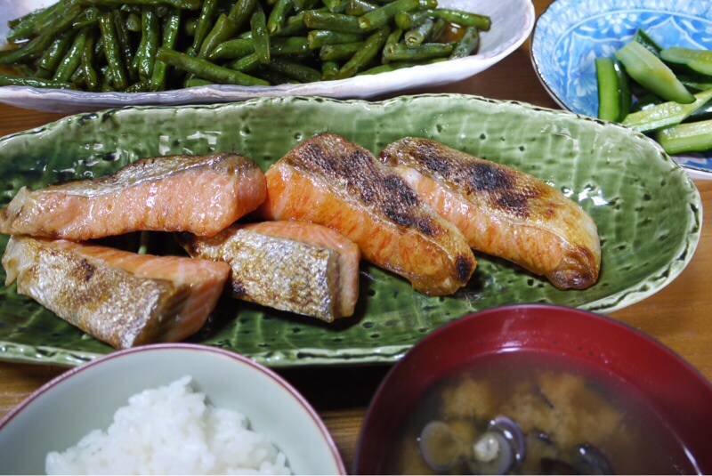 朝食は 焼き鮭 さやいんげんの炒め物 胡瓜浅漬け しじみの味噌汁です。いんげんと胡瓜は自家製 しじみは小川原湖のものです。今朝も妹が作ってくれました。なんだか民宿の朝のようです。