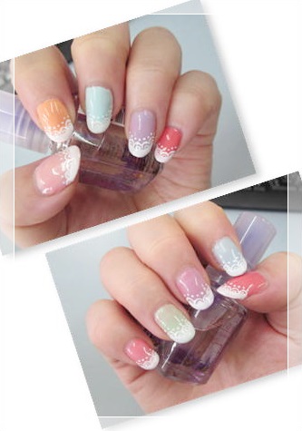 今回はマカロンカラー7色+ホワイトジェルでフレンチにレース風模様にしました。