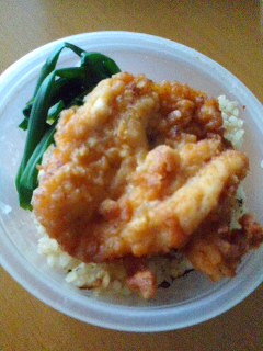 今日の夕飯は、買ってきたケンタッキー骨なしチキンをご飯に乗っけて